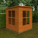 The summerhouse has a single full-boarded tongue & groove door with a lock and key. The windows use 3mm toughened glass.